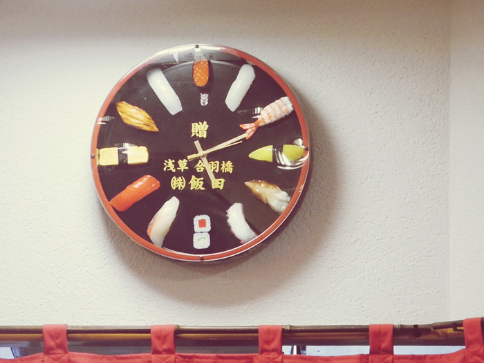 | Cool sushi clock! Notice that the hands of the clock resemble chopsticks and the exterior of the clock looks like a bento bowl. |
