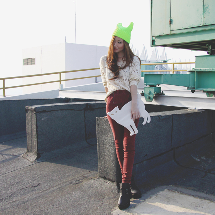 ReplyDeletethat cat bag and the neon beanie are so hyped!