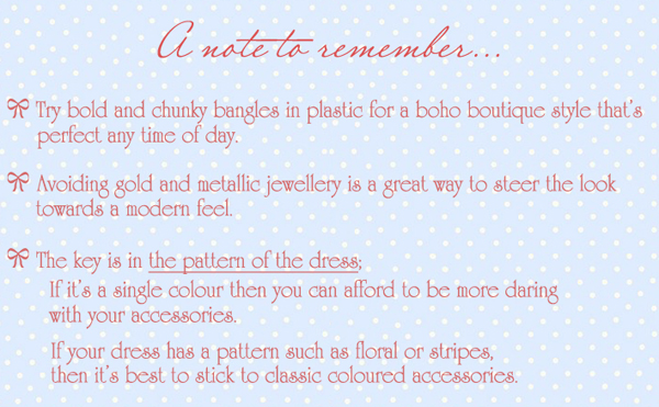 When selecting jewellery to wear with your occasion dress during the daytime, keep it simple. Avoiding anything too over the top will keep you from drifting into the evening wear zone.